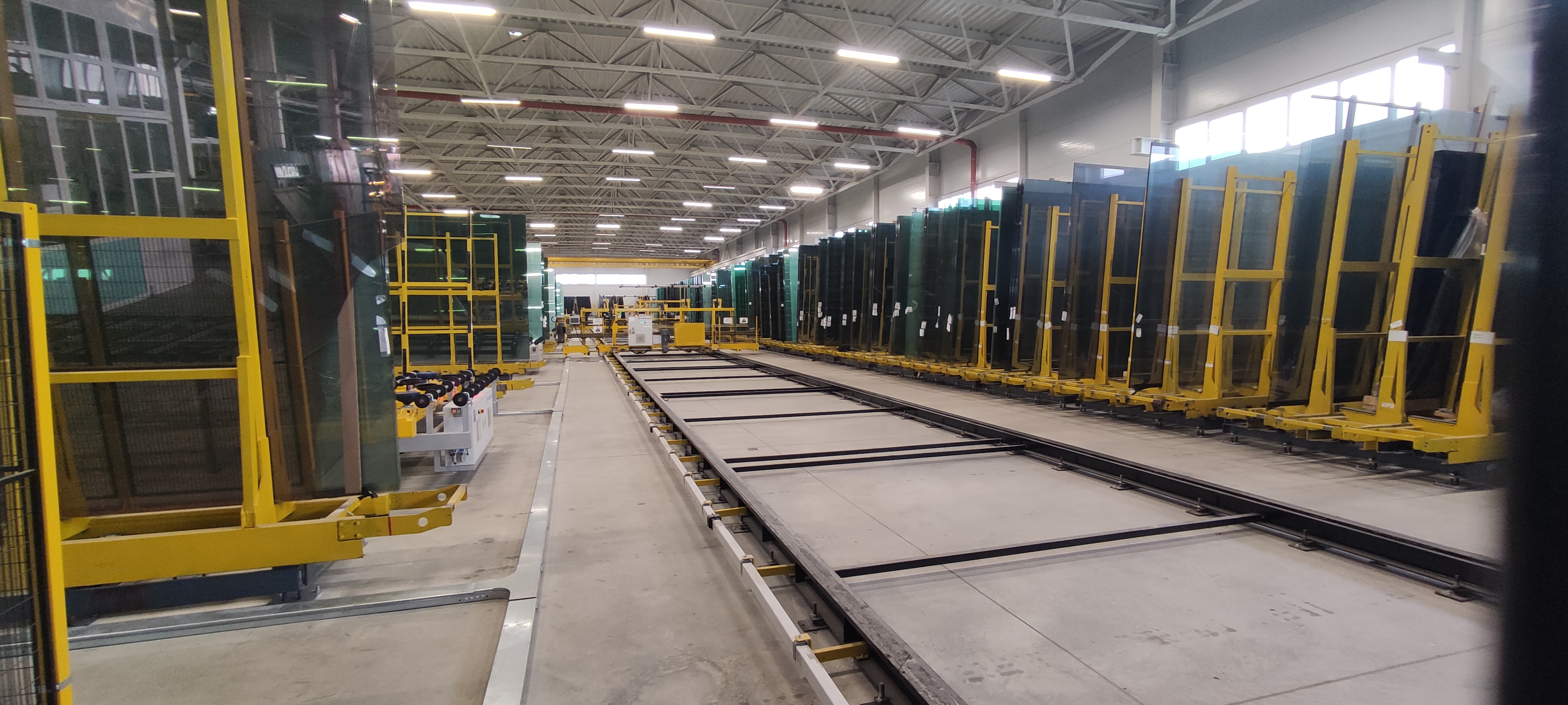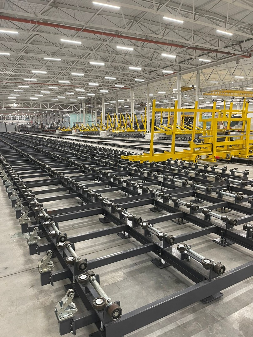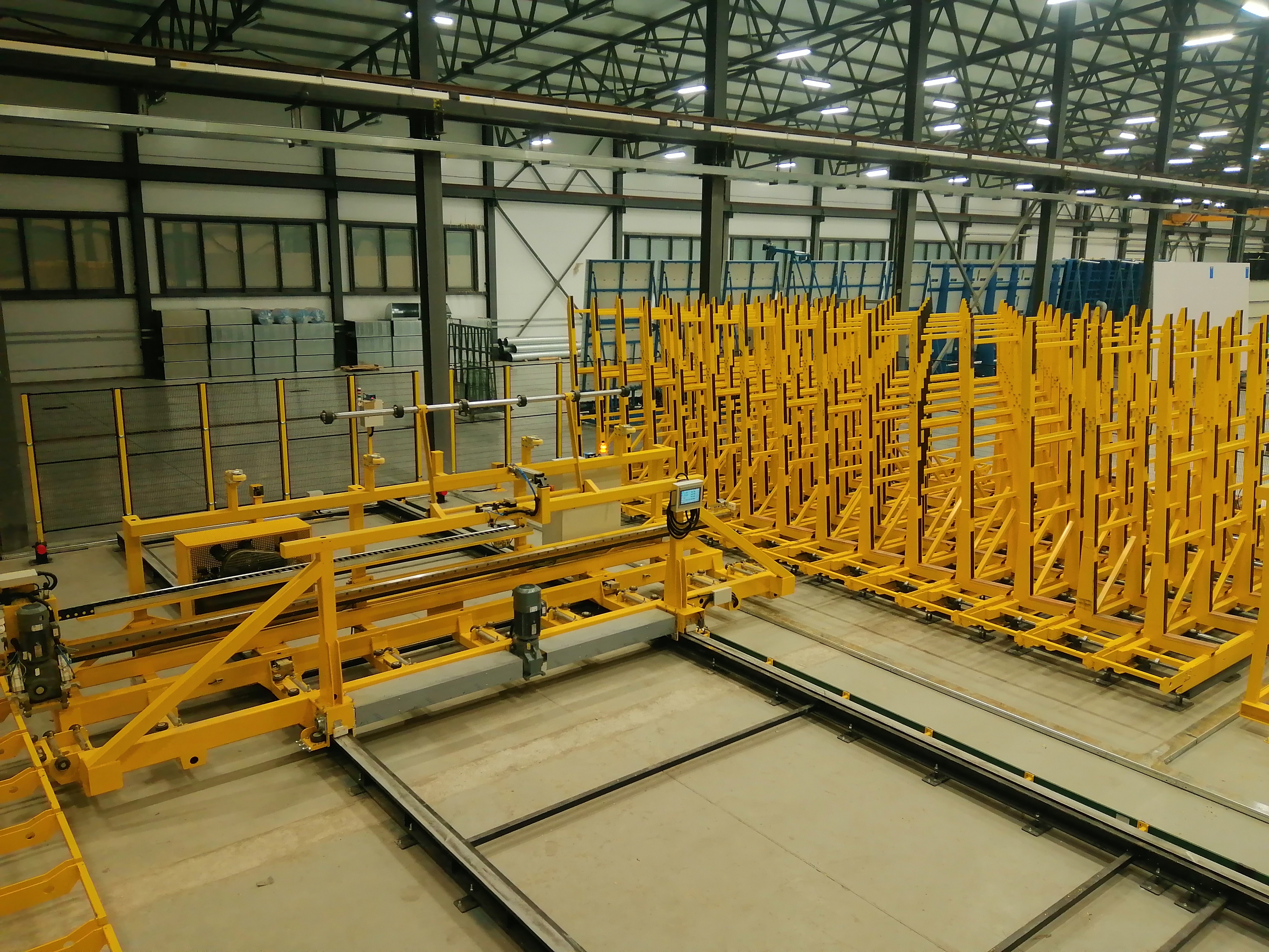 The shuttle system can automatically supply glass for loading table. There is a glass feeding station for float glass unloading from truck then the shuttle equipment will automatically send the glasses with the rack to the position that required by the control system. After getting the instruction from the control system, the glasses with the rack will send to the loading area of cutting line. All the glass data such as dimension, thickness and color will be input the database then all the information can be shared with the central control system. The whole system with high degree of automation and it is safe and reliable.